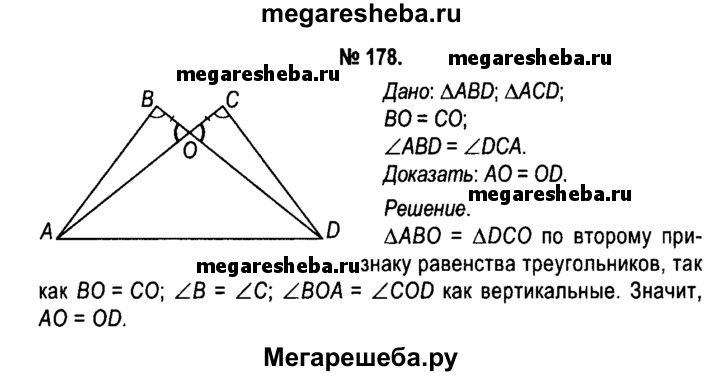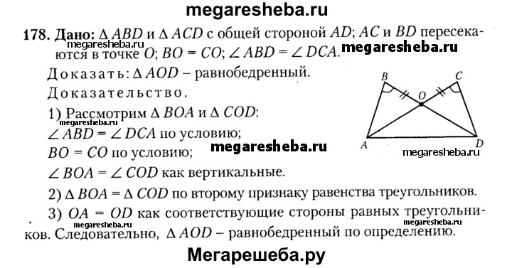 178. Два треугольника ABD и ACD с общей стороной AD расположены в плоскости так, что стороны АС и BD пересекаются в точке О. Докажите, что треугольник AOD равнобедренный, если ВО = СО и угол ABD = углу DCA.
