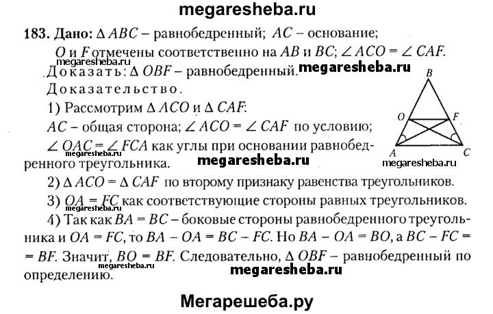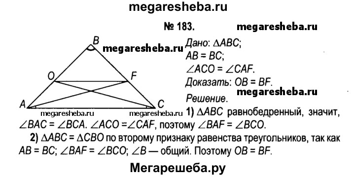 183. В равнобедренном треугольнике ABC с основанием АС на сторонах АВ и ВС лежат соответственно точки О и F так, что угол ACO = углу CAF. Докажите, что треугольник OBF равнобедренный.
