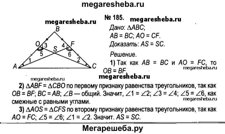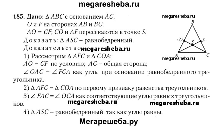 185. В равнобедренном треугольнике ABC с основанием АС на сторонах АВ и ВС соответственно лежат точки О и F так, что АО = CF. Отрезки СО и AF пересекаются в точке S. Докажите, что треугольник ASC равнобедренный.