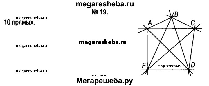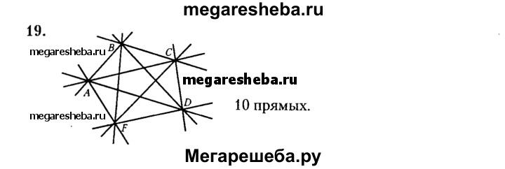 19. Отметьте пять точек А, В, С, D и F, каждые три из которых не лежат на одной прямой. Через каждые две точки проведите прямые. Сколько таких прямых получается?