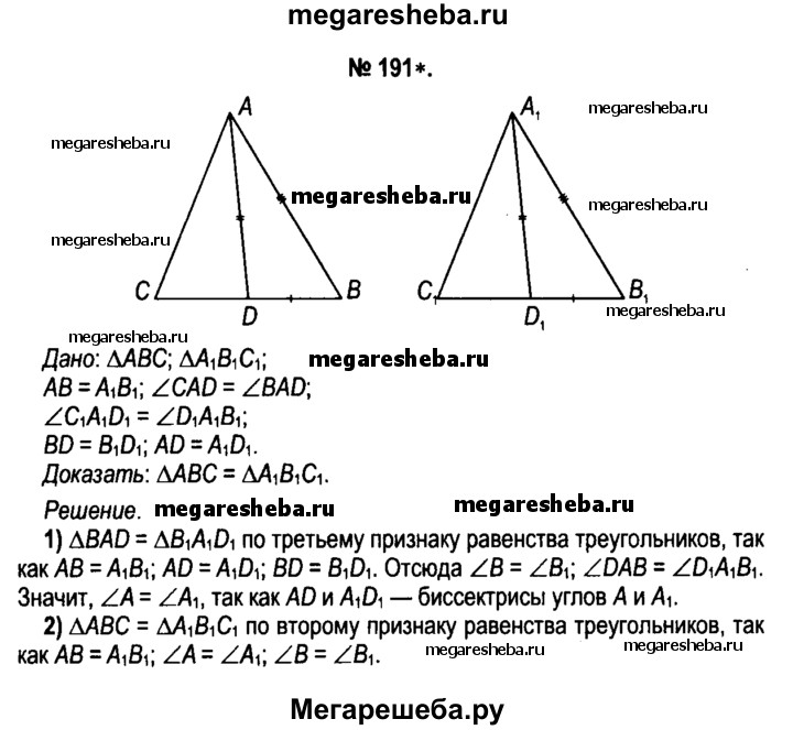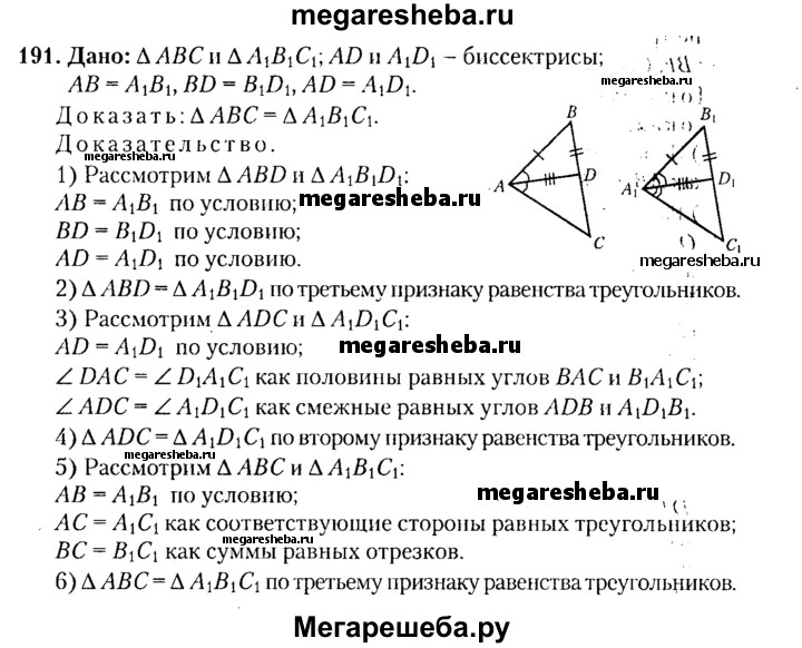 191. Отрезки AD и A₁D₁ — биссектрисы треугольников ABC и А₁В₁С₁ соответственно. Докажите, что треугольники ABC и А₁В₁С₁ равны, если известно, что AB=A₁B₁, BD = B₁D₁ и AD=A₁D₁.