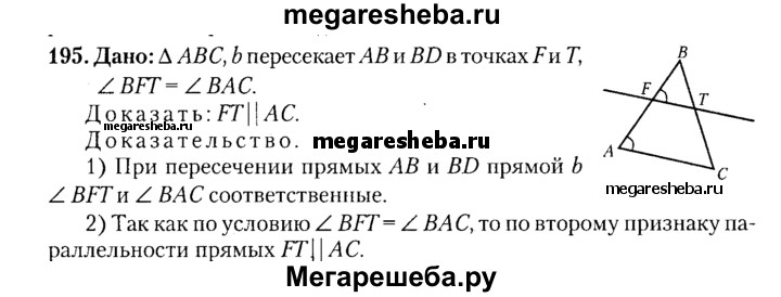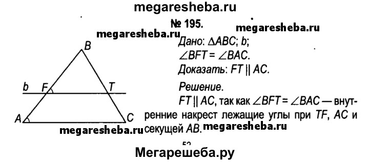195. Прямая b пересекает стороны АВ и ВС треугольника ABC соответственно в точках F и Т так, что угол BFT = углу BAC, Докажите, что прямые FT и АС параллельны.