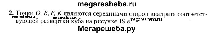 2. На рисунке 19, а, б изображен куб. Точки О, Е, F, К — середины ребер куба. Верно ли, что точки О, Е, F, К на сторонах квадрата соответствующей развертки куба должны быть серединами сторон квадрата (рис. 19, в)?