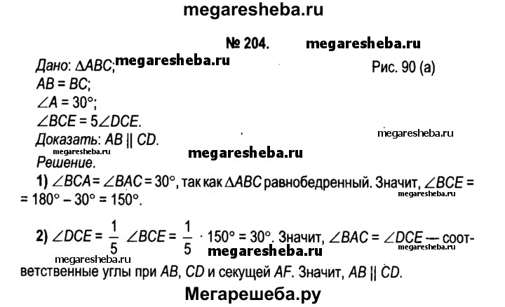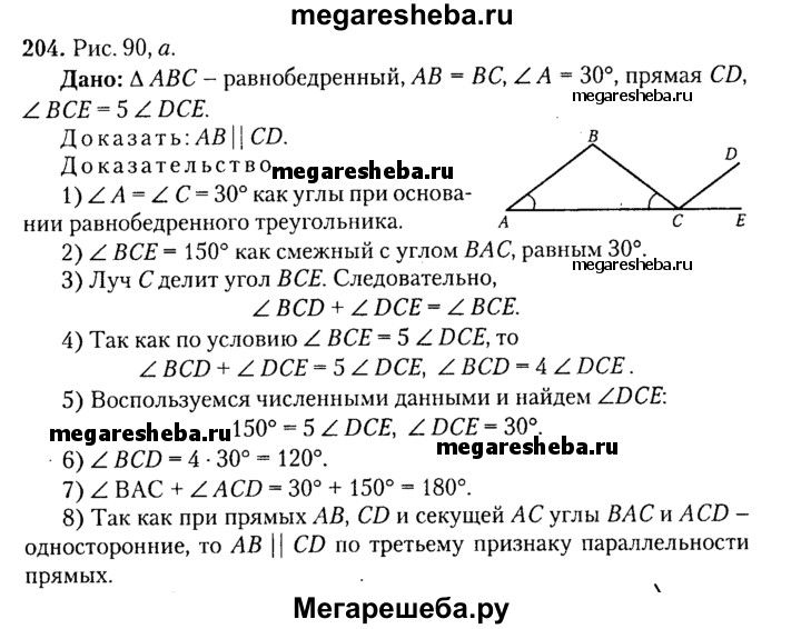 204. Отрезки АВ и ВС — боковые стороны равнобедренного треугольника ABC, у которого угол A = 30°. Луч CD проведен так, что угол BCE = 5углов DCE (рис. 90, а). Докажите, что прямые АВ и CD параллельны.