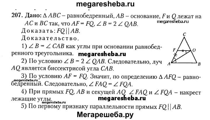 207. Отрезок АВ — основание равнобедренного треугольника ABC. Точки F и Q лежат соответственно на сторонах АС и ВС так, что AF = FQ и угол B = 2угла QAB. Докажите, что прямая FQ параллельна прямой АВ.