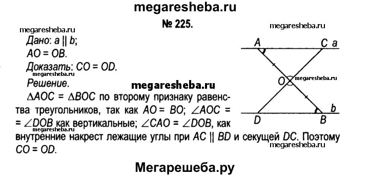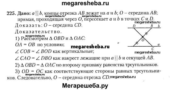 225. Концы отрезка АВ лежат на параллельных прямых а и b. Прямая, проходящая через середину О этого отрезка, пересекает прямые а и b в точках С и D соответственно. Докажите, что точка О — середина отрезка CD.