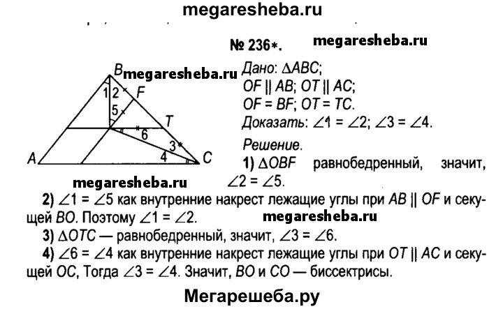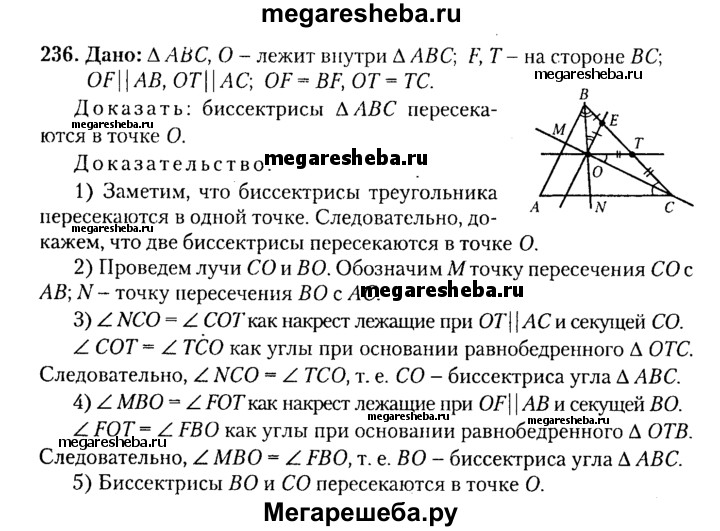 236. Точка О лежит внутри треугольника ABC, а точки F и Т лежат на его стороне ВС так, что OF || АВ, ОТ || AC, OF = BF и ОТ=ТС. Докажите, что биссектрисы треугольника ABC пересекаются в точке О.