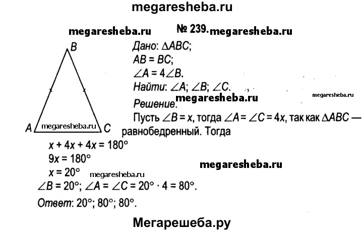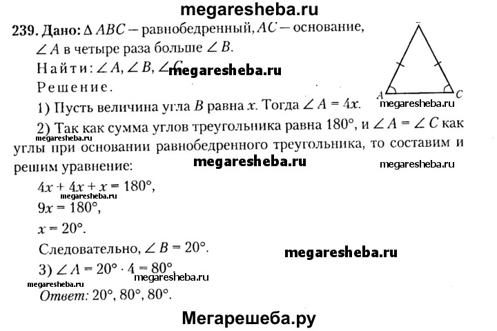 239. В равнобедренном треугольнике угол при основании в четыре раза больше угла при вершине этого треугольника. Вычислите градусные меры углов этого треугольника.