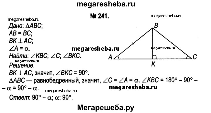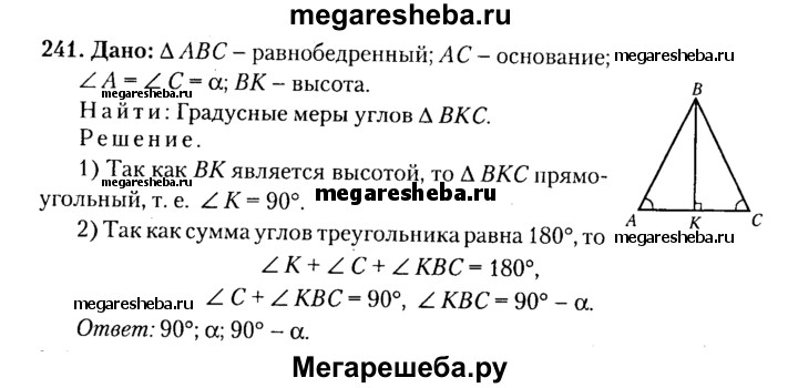 241. В равнобедренном треугольнике ABC угол при его основании АС равен α, отрезок ВК — высота треугольника ABC. Найдите градусные меры углов треугольника ВКС.