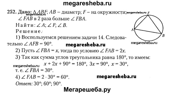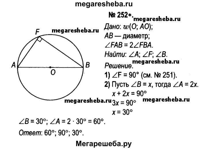 252. Вершины треугольника ABF лежат на окружности, отрезок АВ — диаметр окружности. Вычислите градусные меры углов треугольника, если угол FAB в два раза больше угла FBA.