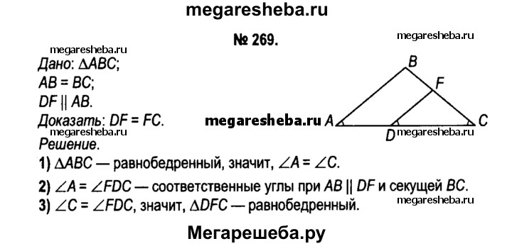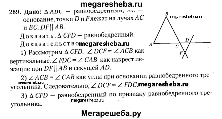 269. АВС — равнобедренный треугольник с основанием АС. Точки D и F лежат на лучах АС и ВС так, что DF || АВ. Докажите, что треугольник CFD является равнобедренным.
