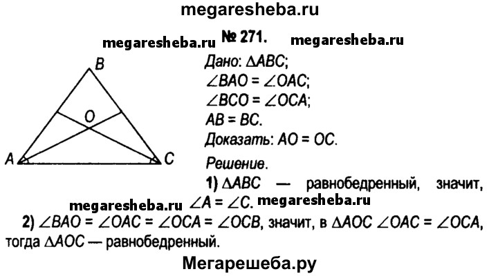 271. Биссектрисы углов А и С равнобедренного треугольника ABC с основанием АС пересекаются в точке О. Докажите, что треугольник АОС равнобедренный.