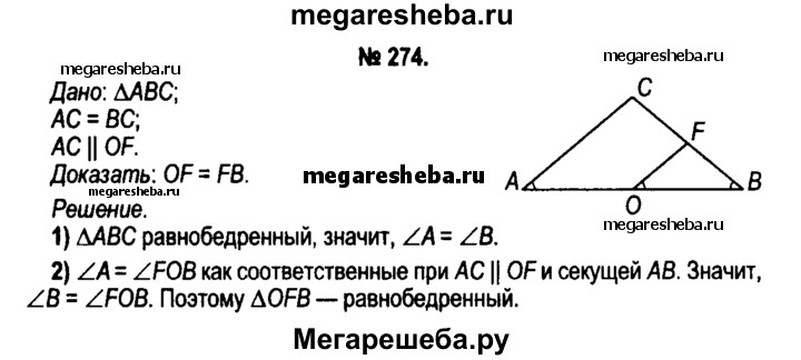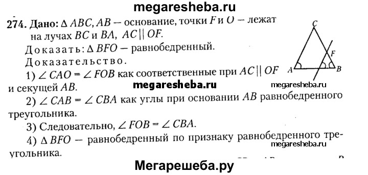 274. В равнобедренном треугольнике ABC с основанием АВ на лучах ВС и ВА. взяты соответственно точки F и О так, что прямые АС и OF параллельны. Докажите, что треугольник BFO равнобедренный.