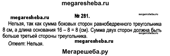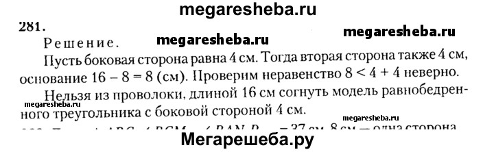 281. Можно ли, согнув проволоку длиной 16 см, получить модель равнобедренного треугольника, длина боковой стороны которого равна 4 см? Ответ поясните.