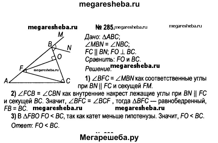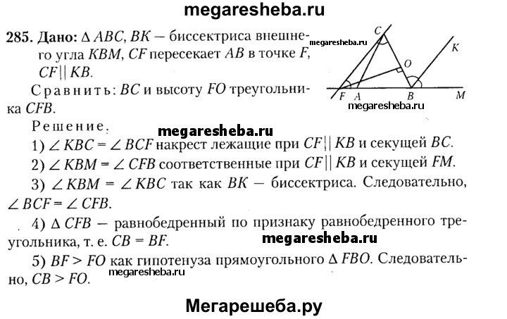 285. Прямая CF параллельна биссектрисе внешнего угла при вершине В треугольника ABC и пересекает сторону АВ в точке F. Сравните сторону ВС и высоту FO треугольника CFB.