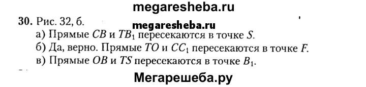 30. На рисунке 32, б изображена треугольная призма и прямые, лежащие в плоскости боковой грани CC₁B₁B. а) В какой точке пересекаются прямые СВ и ТВ₁? б) Верно ли, что прямые ТО и СС₁ пересекаются в точке F? в) Назовите точку пересечения прямых ОВ и TS.