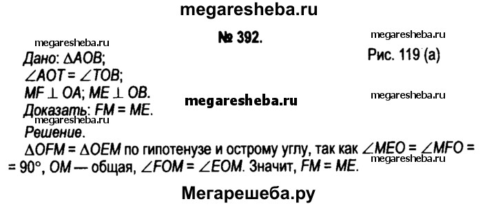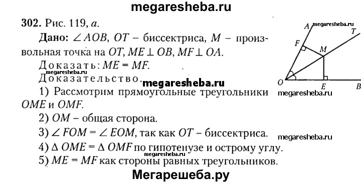 302. На рисунке 119, а точка М — произвольная точка биссектрисы ОТ неразвернутого угла АОВ. Докажите, что перпендикуляры MF и ME, проведенные к сторонам угла, равны.