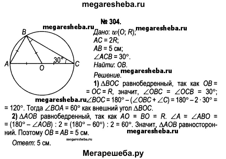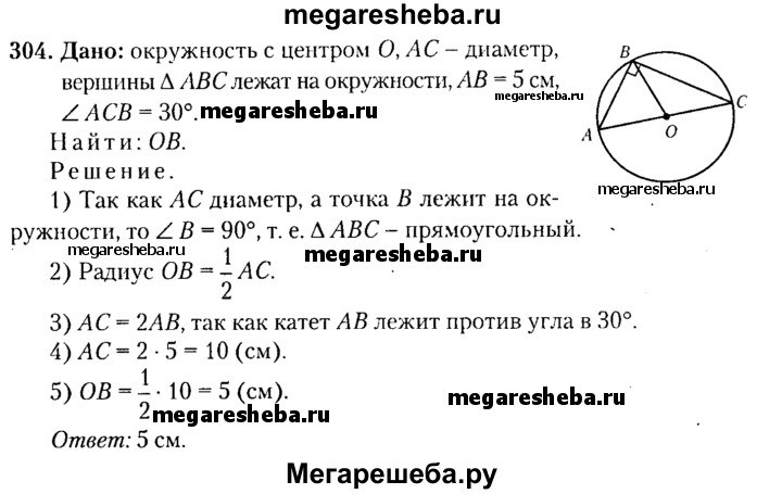 304. Вершины треугольника ABC лежат на окружности, центром которой является точка О. Отрезок АС — диаметр окружности, АВ = 5 см и угол ACB = 30°. Вычислите расстояние от вершины В до центра окружности.