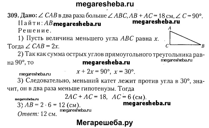 309. Один из острых углов прямоугольного треугольника в два раза больше другого. Вычислите длину гипотенузы, если сумма длин гипотенузы и меньшего катета равна 18 см.