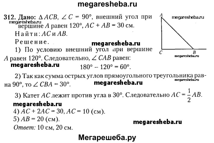 312. В прямоугольном треугольнике ABC с прямым углом С градусная мера внешнего угла при вершине А равна 120°, а сумма длин катета АС и гипотенузы АВ равна 30 см. Вычислите длины сторон АС и АВ.
