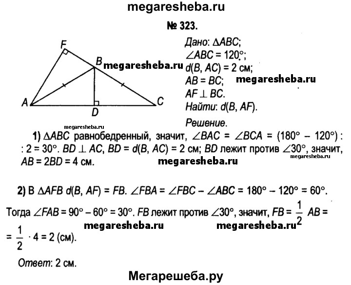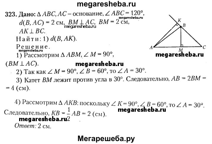 323. В равнобедренном треугольнике ABC градусная мера угла, лежащего против основания АС, равна 120°. Вычислите расстояние от вершины В до прямой, проходящей через вершину А и перпендикулярной прямой ВС, если расстояние от вершины В до прямой АС равно 2 см.