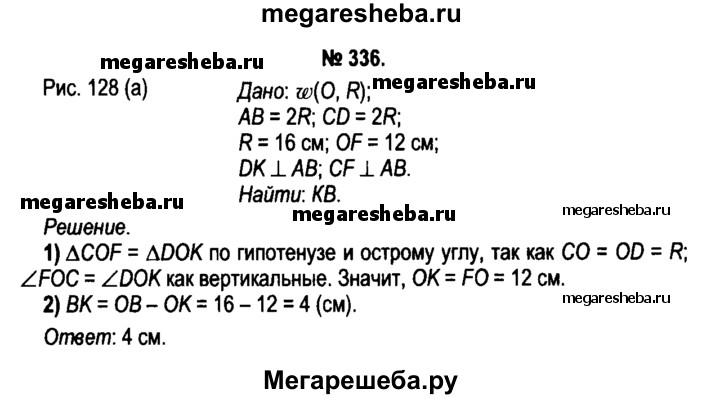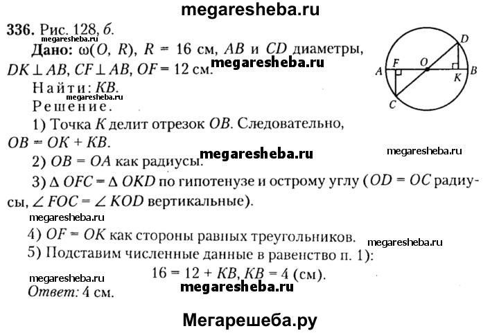 336. Отрезки АВ и CD — диаметры окружности с центром в точке О и радиусом 16 см, DK и CF — перпендикуляры, проведенные к прямой, содержащей диаметр АВ. Вычислите длину отрезка KB, если OF =12 см (рис. 128, б).