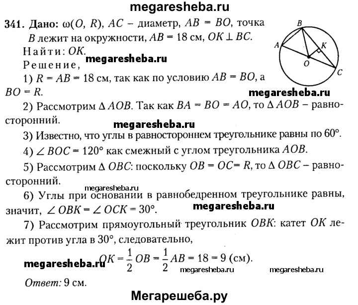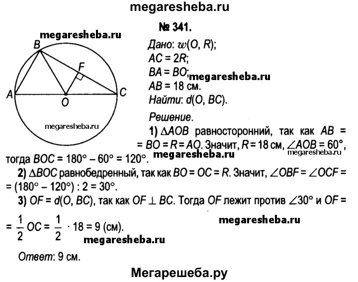 341. Отрезок АС — диаметр окружности, а точка В окружности равноудалена от точки А и центра О окружности. Вычислите расстояние от центра окружности до прямой ВС, если известно, что АВ = 18 см.