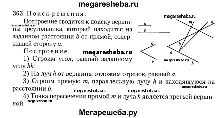 363. Даны отрезки а, b и угол hk. Постройте треугольник, сторона которого равна а, прилежащий к ней угол равен углу hk, а высота, проведенная к этой стороне, равна отрезку b.