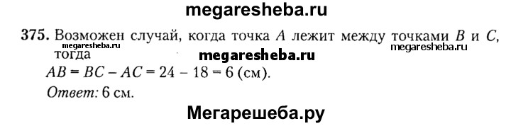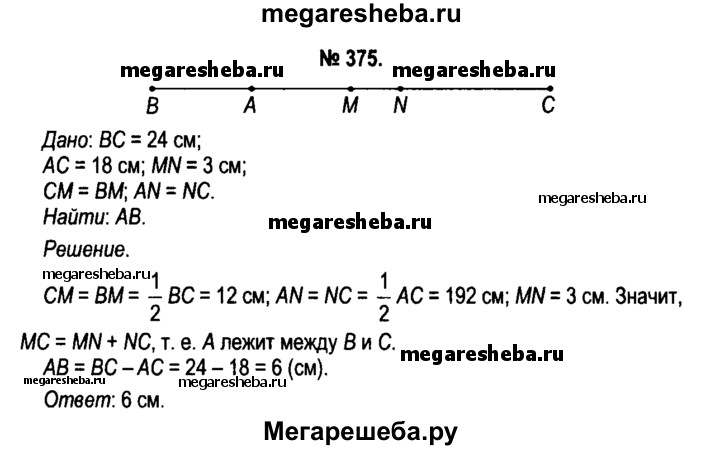 375. Точки А, В и С лежат на одной прямой, а длины отрезков ВС и АС равны 24 см и 18 см соответственно. Вычислите длину отрезка АВ, если расстояние между серединами отрезков ВС и АС равно 3 см.