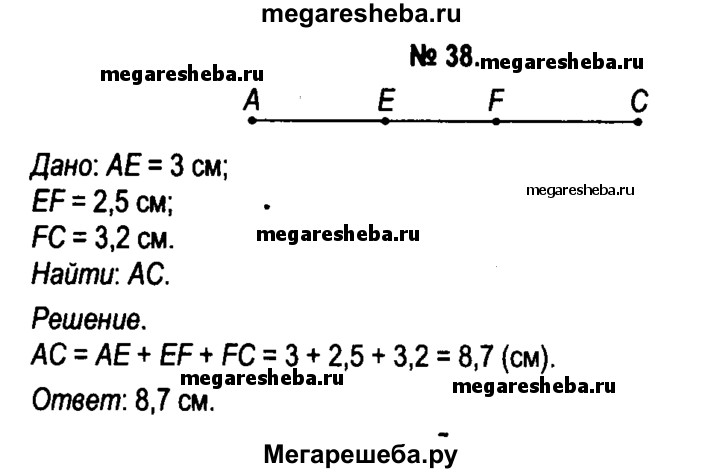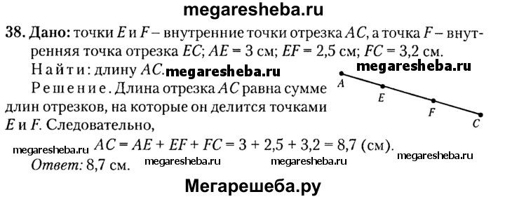 38. Точки Е и F — внутренние точки отрезка АС, а точка F — внутренняя точка отрезка ЕС. Вычислите длину отрезка АС, если АЕ = 3 см, EF = 2,5 см, FC = 3,2 см.