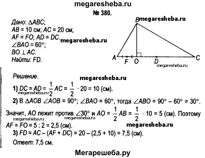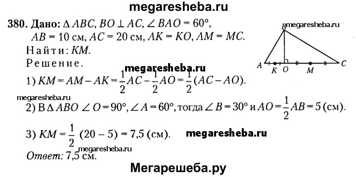 380. Отрезок ВО — высота треугольника ABC, угол BAO = 60°, АВ = 10 см, АС = 20 см. Вычислите расстояние между серединой стороны АС и серединой отрезка АО.