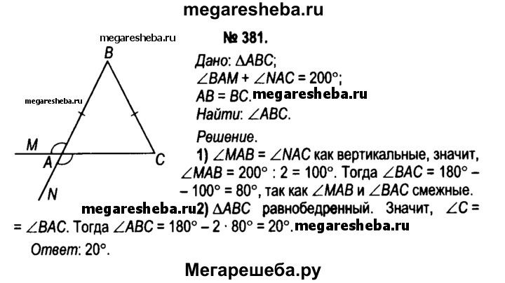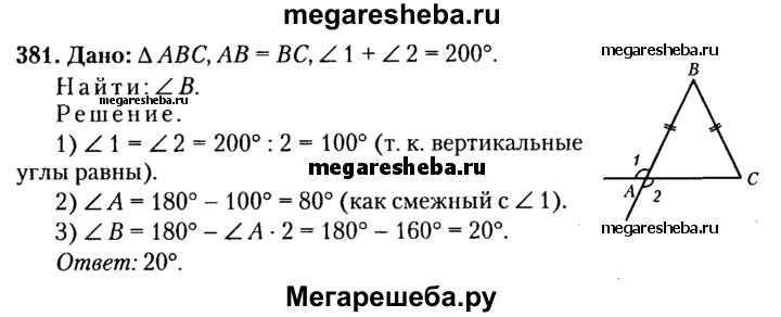 381. Отрезок АС — основание равнобедренного треугольника АВС. Сумма градусных мер вертикальных углов, образованных при пересечении прямых АВ и АС, равна 200°. Вычислите градусную меру внутреннего угла при вершине В треугольника ABC.
