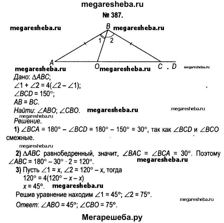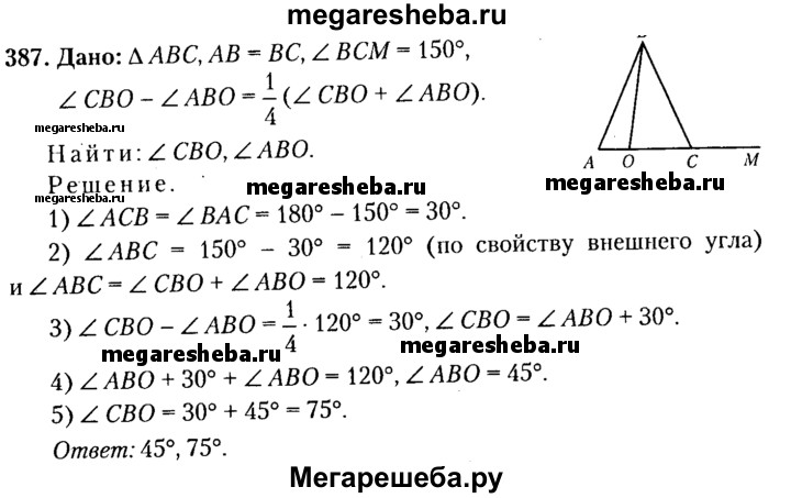 387. Отрезок АС — основание равнобедренного треугольника ABC. Градусная мера внешнего угла треугольника при вершине основания равна 150°. Точка О лежит на основании АС так, что разность градусных мер углов СВО и АВО меньше суммы их градусных мер в 4 раза. Вычислите градусные меры углов СВО и АВО.