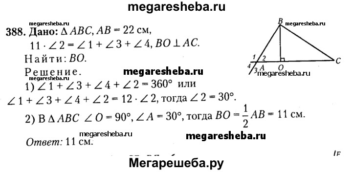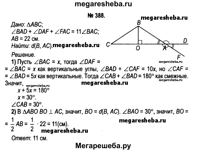 388. В треугольнике ABC длина стороны АВ равна 22 см, а градусная мера одного из четырех углов, образованных при пересечении прямых АВ и АС, в 11 раз меньше суммы градусных мер трех остальных углов. Вычислите расстояние от вершины В до прямой АС.