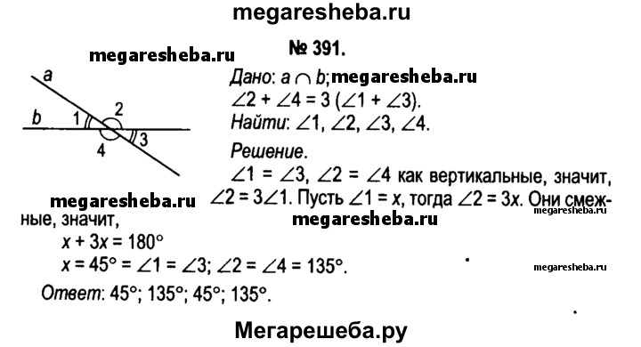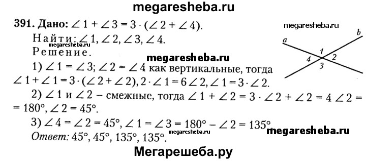 391. Вычислите градусные меры углов, образованных при пересечении двух прямых, если сумма градусных мер двух из этих углов в три раза меньше суммы градусных мер двух других углов.
