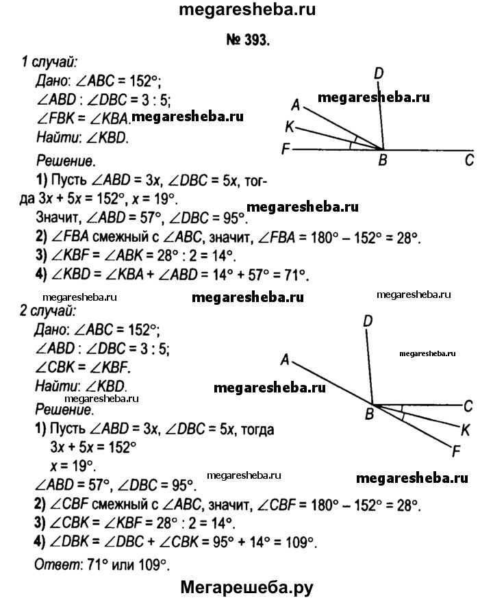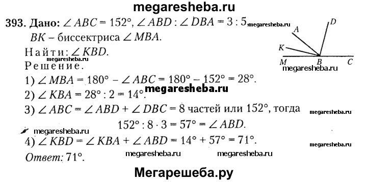 393. Градусная мера угла ABC равна 152°. Луч BD делит данный угол на два угла, градусные меры которых относятся как 3:5, считая от ВА. Вычислите градусную меру угла, сторонами которого служат луч BD и биссектриса угла, смежного с углом ABC.