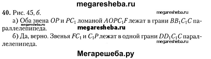 40. На рисунке 45, б изображен прямоугольный параллелепипед и простая замкнутая пространственная ломаная AOPC₁F. а) Назовите грань параллелепипеда, которая содержит оба звена ОР и РС₁. б) Верно ли, что звенья FC₁ и С₁Р содержатся в одной грани параллелепипеда?
