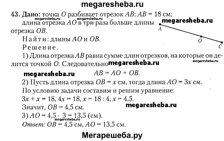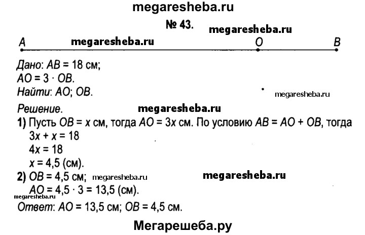 43. Точка О — внутренняя точка отрезка АВ, длина которого равна 18 см. Вычислите длины отрезков АО и ОВ, если длина отрезка АО в три раза больше длины отрезка ОВ.