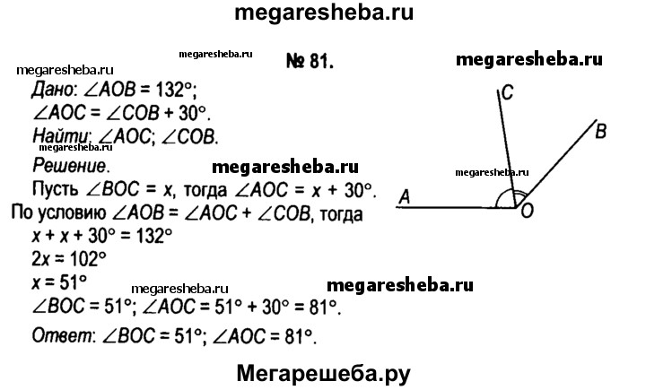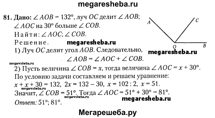 81. Луч ОС делит угол AOB на два угла. Вычислите градусные меры угла AOC и угла COB, если известно, что градусная мера угла AOC на 30° больше градусной меры угла COB, a угол AOB = 132°.