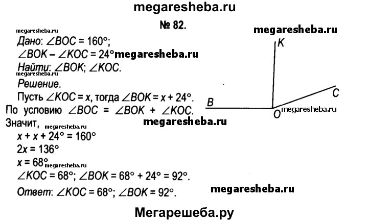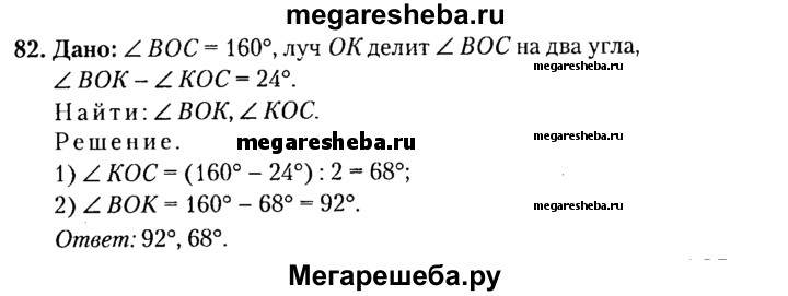 82. Луч ОК делит угол BOC, градусная мера которого равна 160°, на два угла. Вычислите градусные меры углов ВОК и КОС, если их разность равна 24° и угол ВОК больше угла КОС.