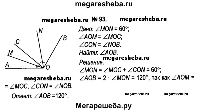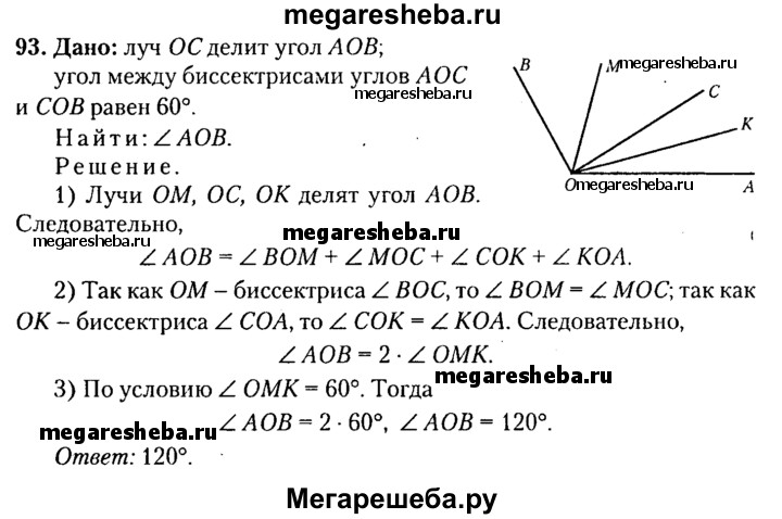 93. Угол АОВ разделен лучом ОС на два угла. Вычислите градусную меру угла АОВ, если градусная мера угла, сторонами которого являются биссектрисы углов АОС и СОВ, равна 60°.