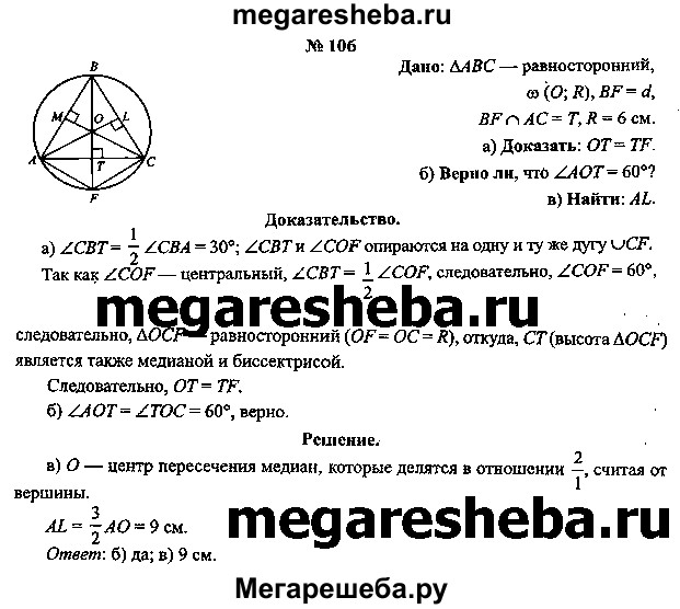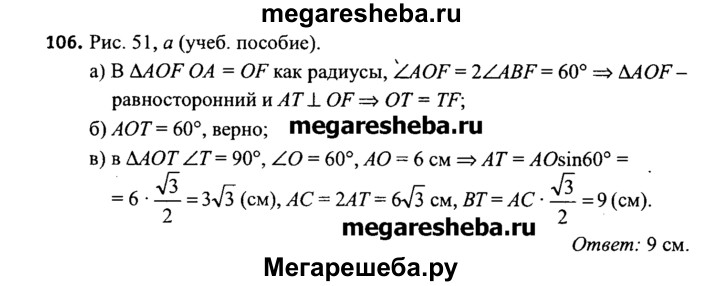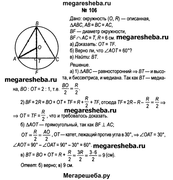 106. Точка О — центр окружности, описанной около равностороннего треугольника ABC, отрезок BF — диаметр окружности, Т = BF ∩ АС (рис. 51, а). а) Докажите, что ОТ = TF. б) Верно ли, что угол AOT = 60°? в) Вычислите высоту треугольника, если радиус описанной окружности равен 6 см.