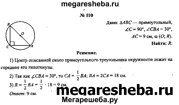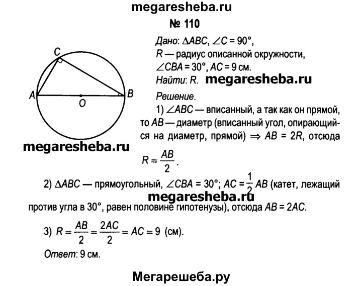 110. Вычислите радиус окружности, описанной около прямоугольного треугольника ABC с прямым углом С, если угол CBA = 30° и АС = 9 см.