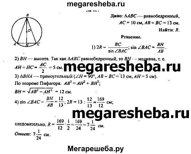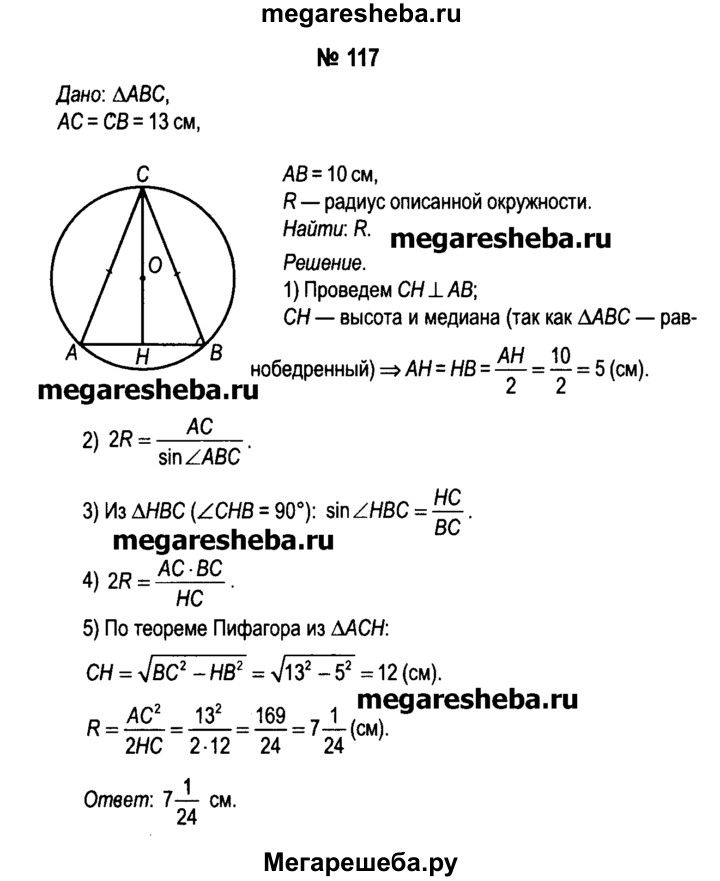 117. Вычислите радиус окружности, описанной около равнобедренного треугольника, если длина его основания равна 10 см, а длина боковой стороны — 13 см