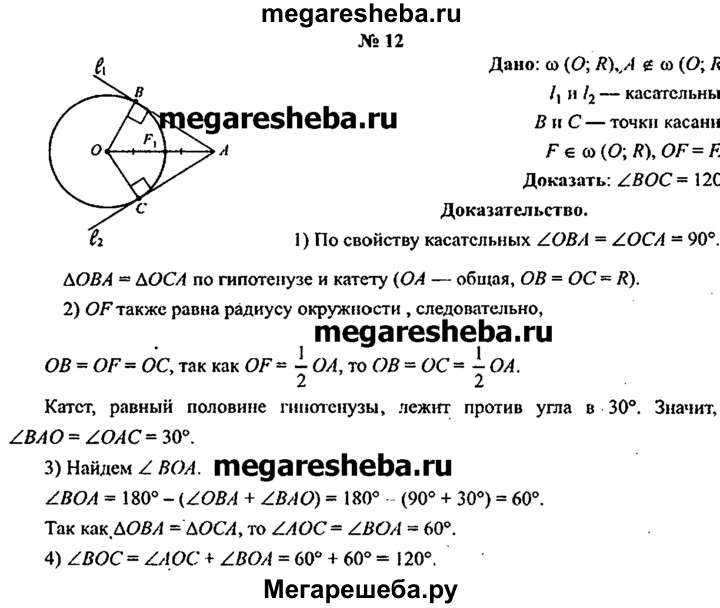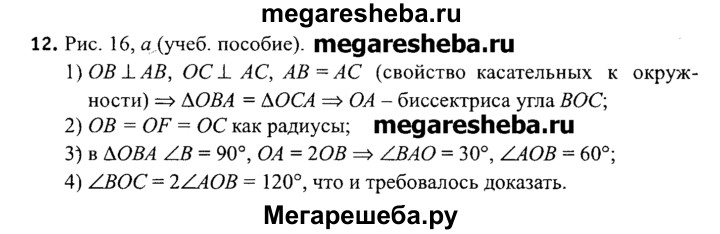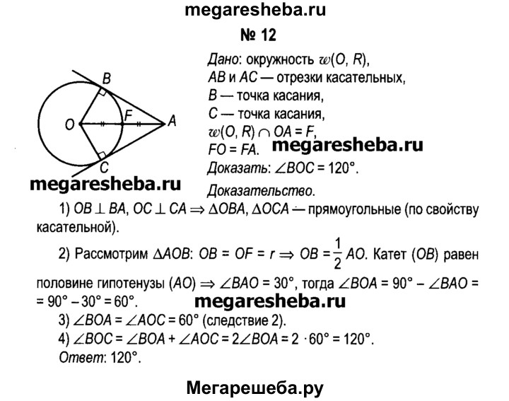 12. Через точку А, лежащую вне окружности ω (О, R), проведены прямые, которые касаются окружности в точках В и С. Окружность пересекает отрезок OA в точке F и OF = FA (рис. 16, а). Докажите, что угол BOC= 120°.
