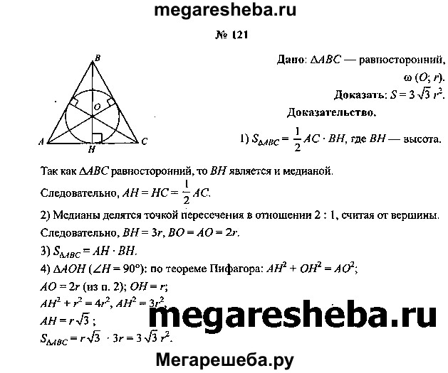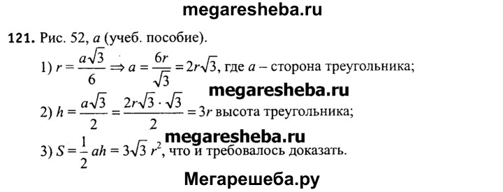 121. Радиус окружности, вписанной в равносторонний треугольник, равен г. Докажите, что площадь этого треугольника можно найти по формуле S = 3√3 r2 (см. рис. 52, а).