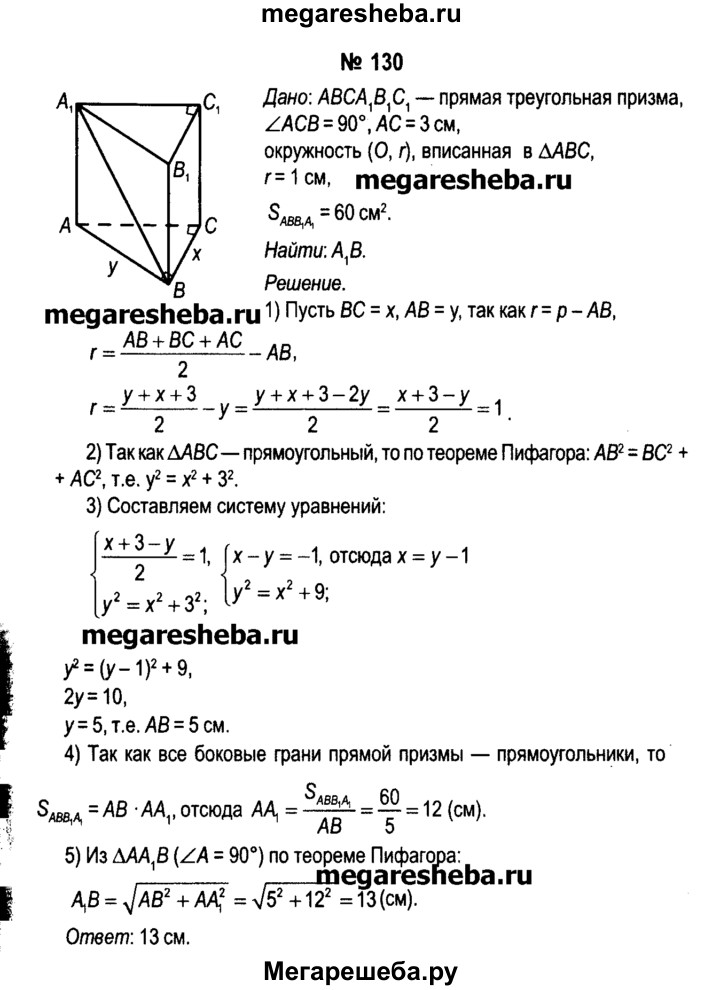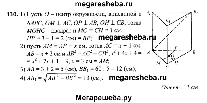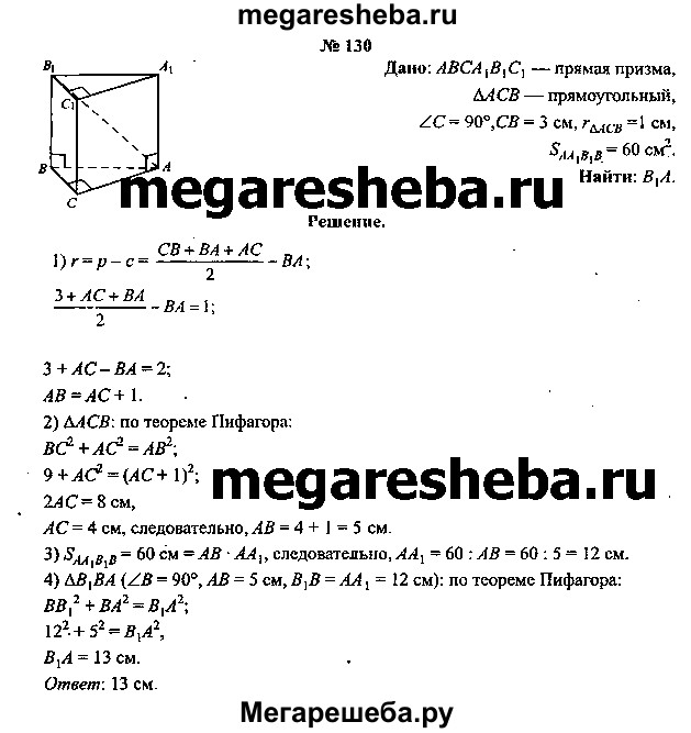 130. Основанием прямой треугольной призмы АВСА1В1С1 является прямоугольный треугольник АСВ с прямым углом С. Вычислите длину диагонали грани АА1В1В, если длина одного из катетов треугольника АСВ равна 3 см, радиус вписанной в него окружности равен 1 см, а площадь грани АА1В1В равна 60 см2.