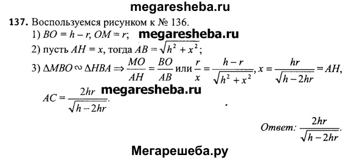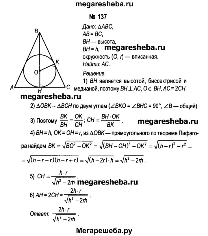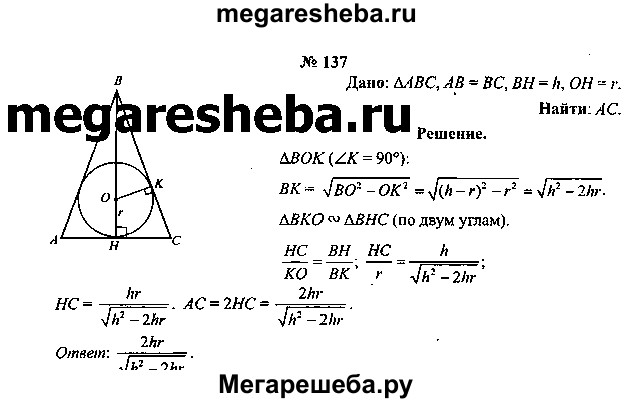 137. Найдите длину основания равнобедренного треугольника, если его высота, проведенная к основанию, равна h, а радиус вписанной окружности равен r.