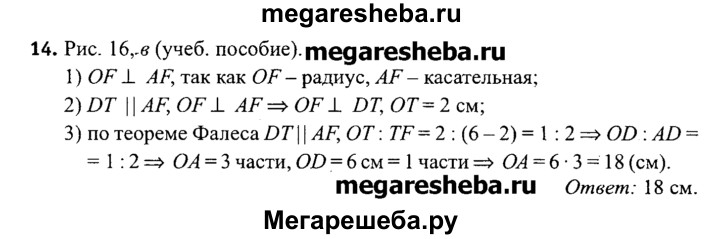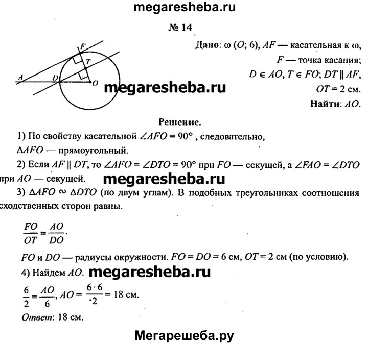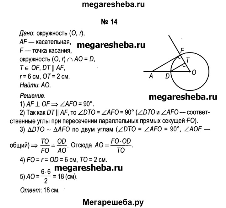 14. Прямая AF касается окружности, центром которой является точка О, в точке F. Окружность пересекает отрезок АО в точке D. Через точку D проведена прямая DT (Т ∈ OF), параллельная прямой AF. Вычислите длину отрезка АО, если радиус окружности равен 6 см, а расстояние от центра окружности до прямой DT равно 2 см (рис. 16, в).