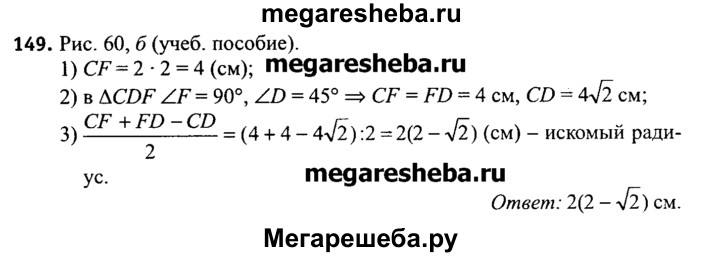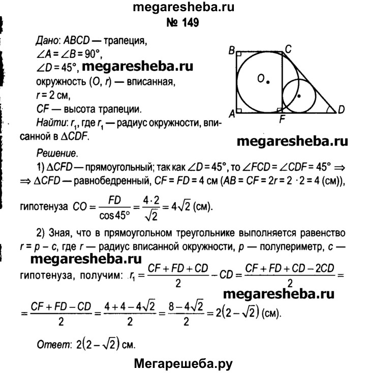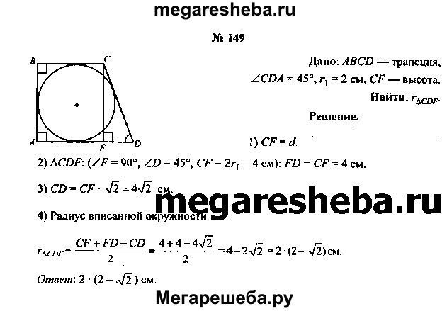 149. В прямоугольную трапецию ABCD, градусная мера острого угла которой равна 45°, вписана окружность, радиус которой равен 2 см. Вычислите радиус окружности, вписанной в треугольник CDF, где отрезок CF — высота трапеции.